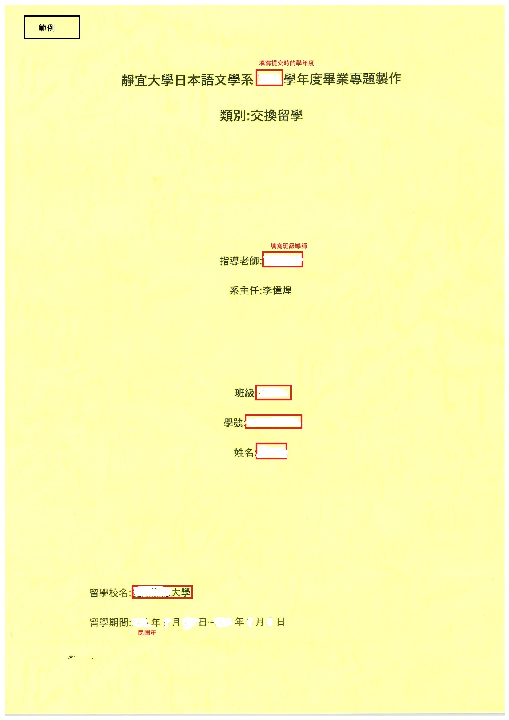 2.需繳交交換留學心得報告書一式兩份,膠裝(封面淡黃色),以日文書寫及錄製8-10分鐘的影片或舉辦分享會,當作統整課程。